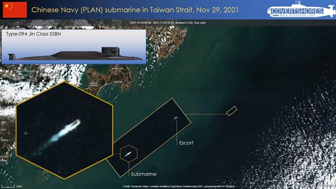 美國潛艦專家薩頓(HI Sutton)貼文,一艘暫定爲094型的晉級戰略核潛艦通過臺灣海峽,此艘潛艦從南海亞龍灣潛艦基地出港向北航行,並由另一艘水面艦護航。(翻攝自H I Sutton_推特)