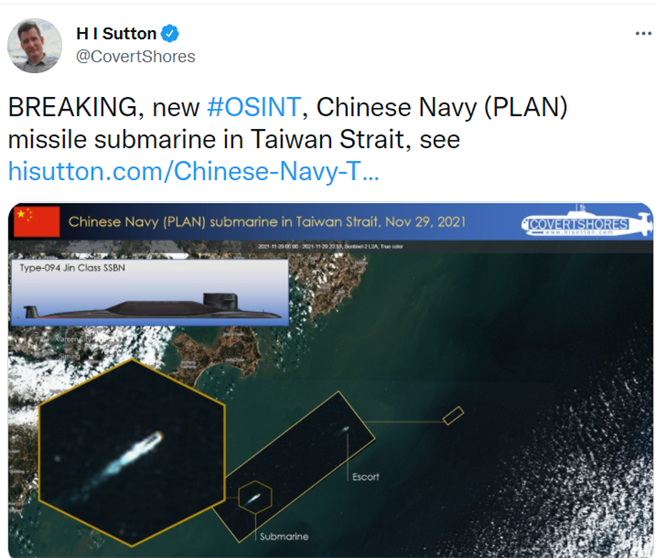美國潛艦專家薩頓於推特貼文,094型的晉級戰略核潛艦通過臺灣海峽,此艘潛艦從南海亞龍灣潛艦基地出港向北航行,並由另一艘水面艦護航。(翻攝自H I Sutton_推特)