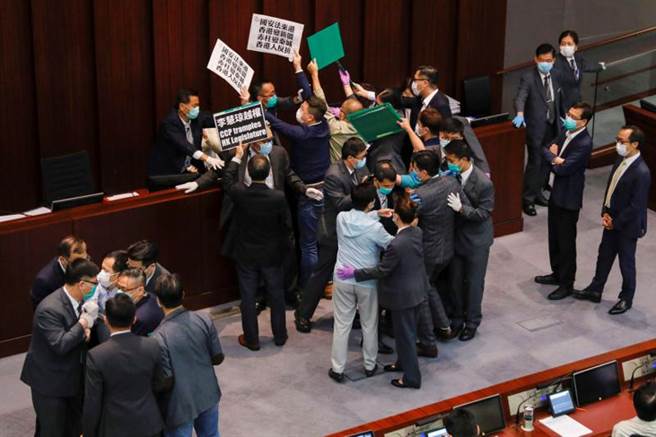 北京將制定港版國安法消息一出,立即激起國際與香港的強烈反彈,香港立法會民主派抗議聲四起,議事完全癱瘓。(圖/路透)
