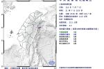 21:52臺灣東部海域發生第一次餘震,芮氏規模4.1,地震深度20公里,各地最大震度,宜蘭2級,花蓮、新北1級。